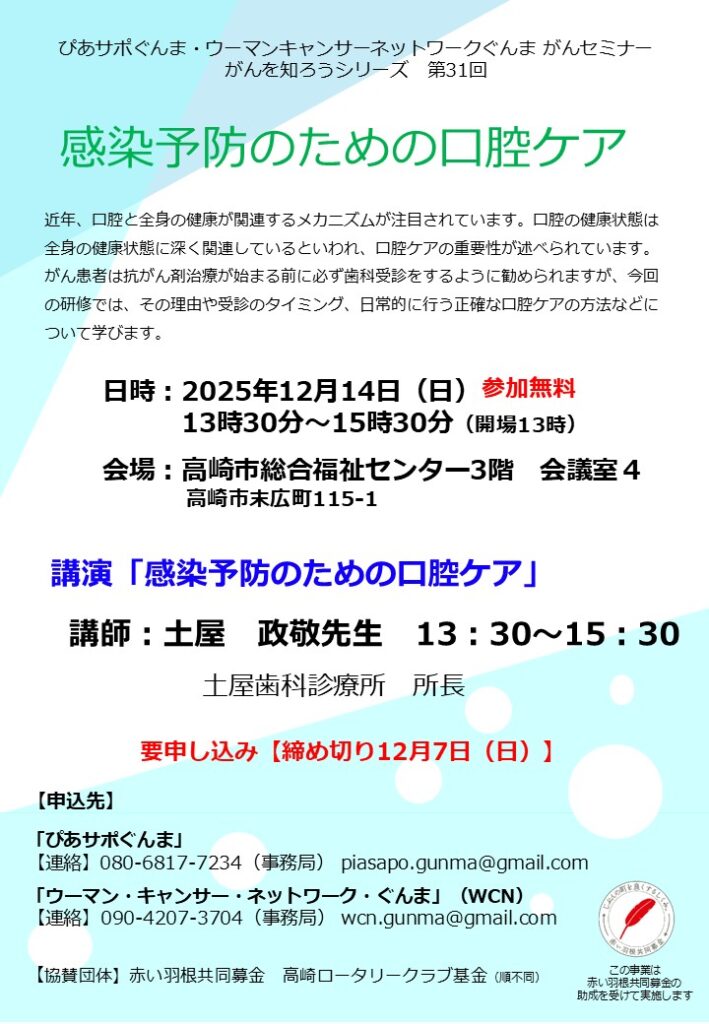 ・『ウーマン・キャンサー・ネットワーク・ぐんま』は、がん闘病を体験した女性患者と家族によるボランティアグループです。